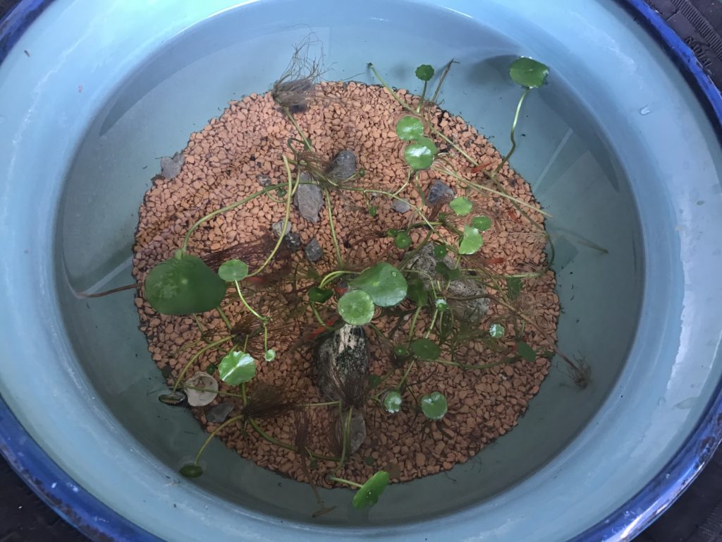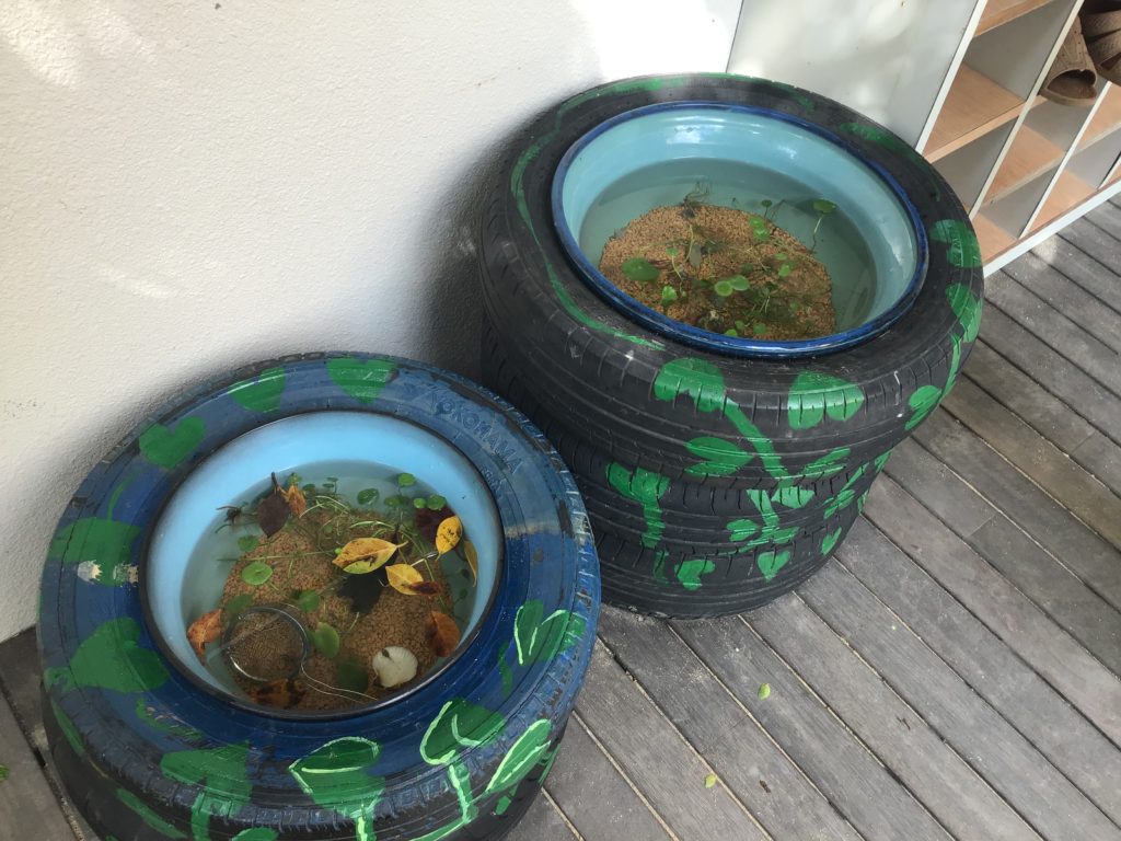 現在、園庭整備でお手伝いをさせていただいている、八重瀬町ののびる保育園さんにて、保育士さんが素敵なビオトープを自作してくれていました。