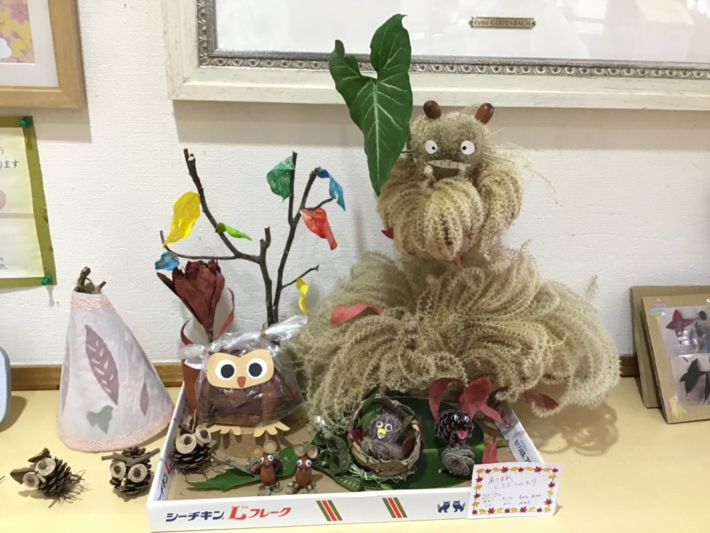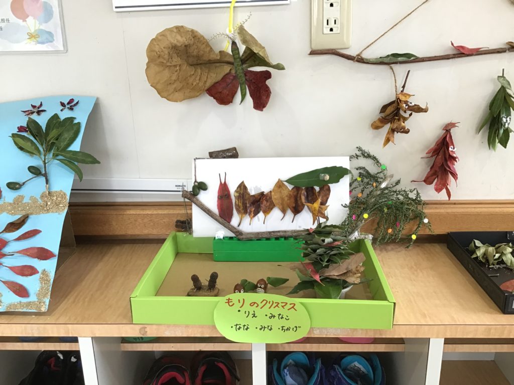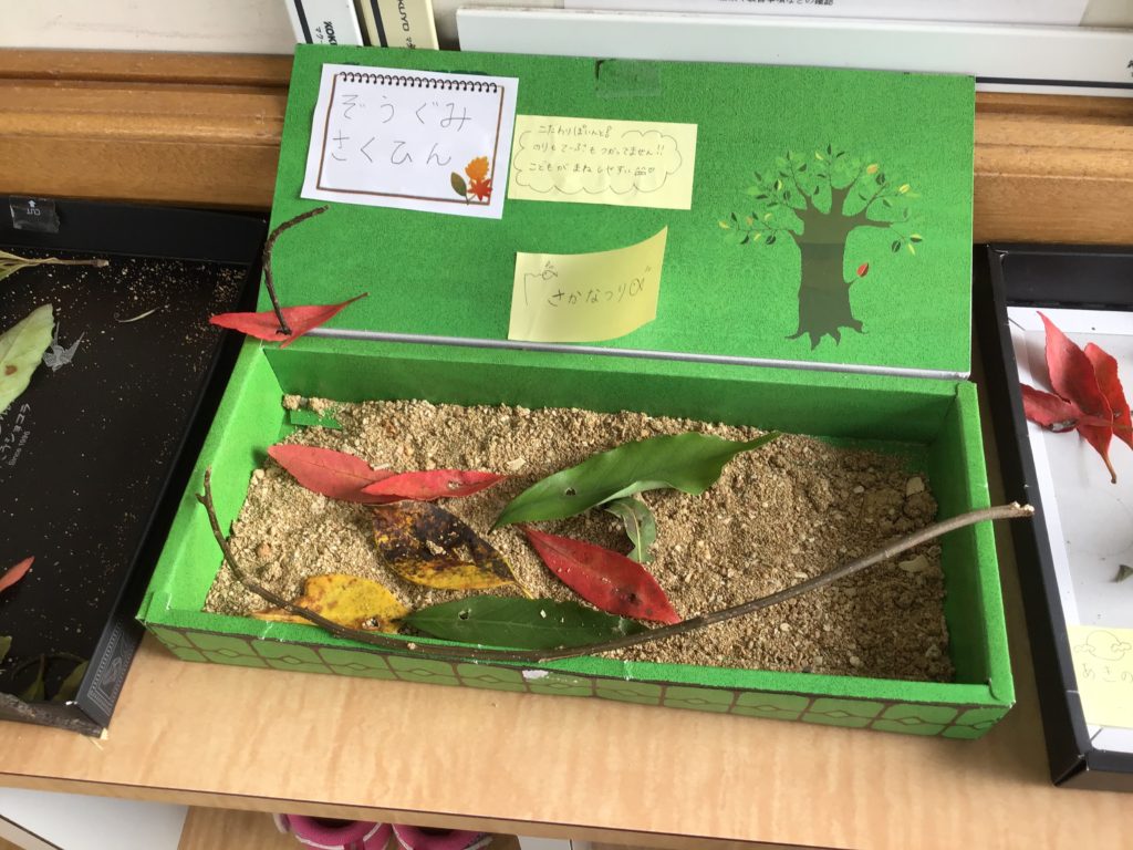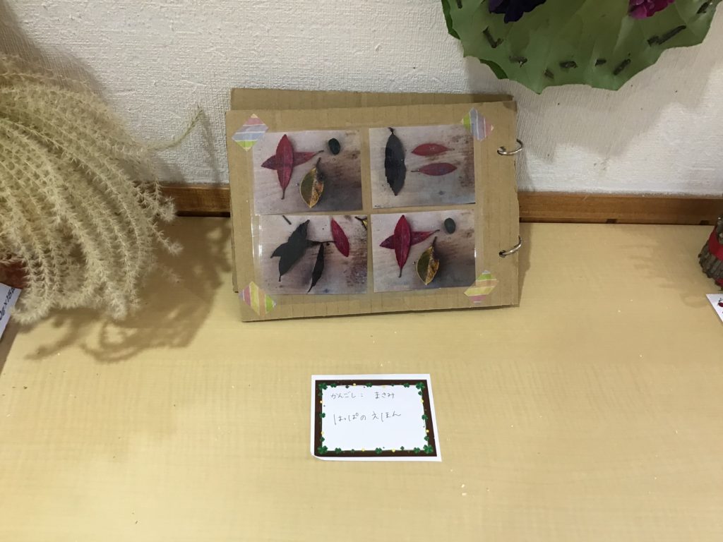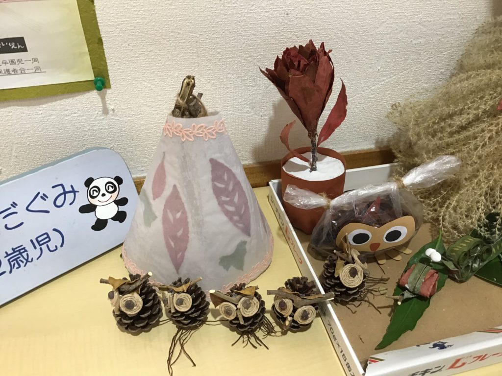 職員の作品展示をした際に、玄関より保護者と子どもの作品に対する会話がたくさん生まれたと話してくれました。保護者も昔やったことがある経験が蘇り、子どもと遊ぶきっかけの参考になったとの話もありました。