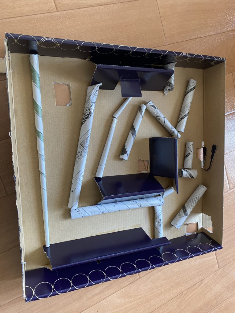 今回は、通路を新聞紙やお菓子の箱で作りましたが、これらを「棒サンゴ」や「木の枝」に変えても楽しいでしょう。また、転がす物もどんぐりや木の実、小豆などにすることで、同じコースでも使う感覚が変わっていきます。