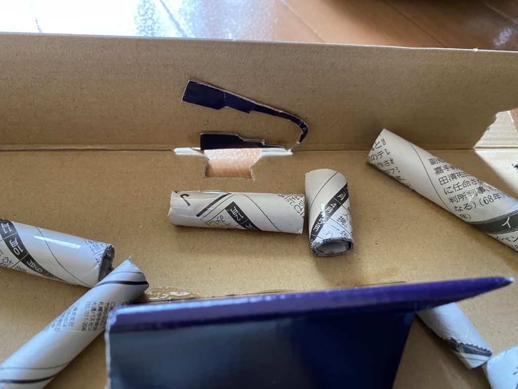 材料は、のり、テープ、お菓子の箱、新聞紙、転がす物 です。