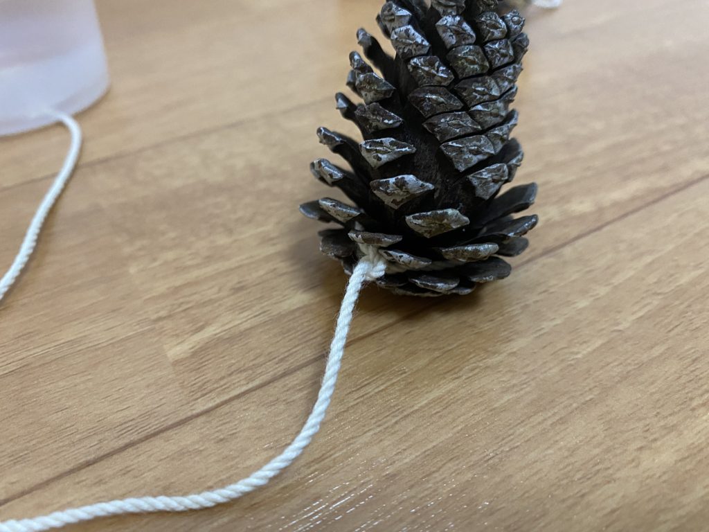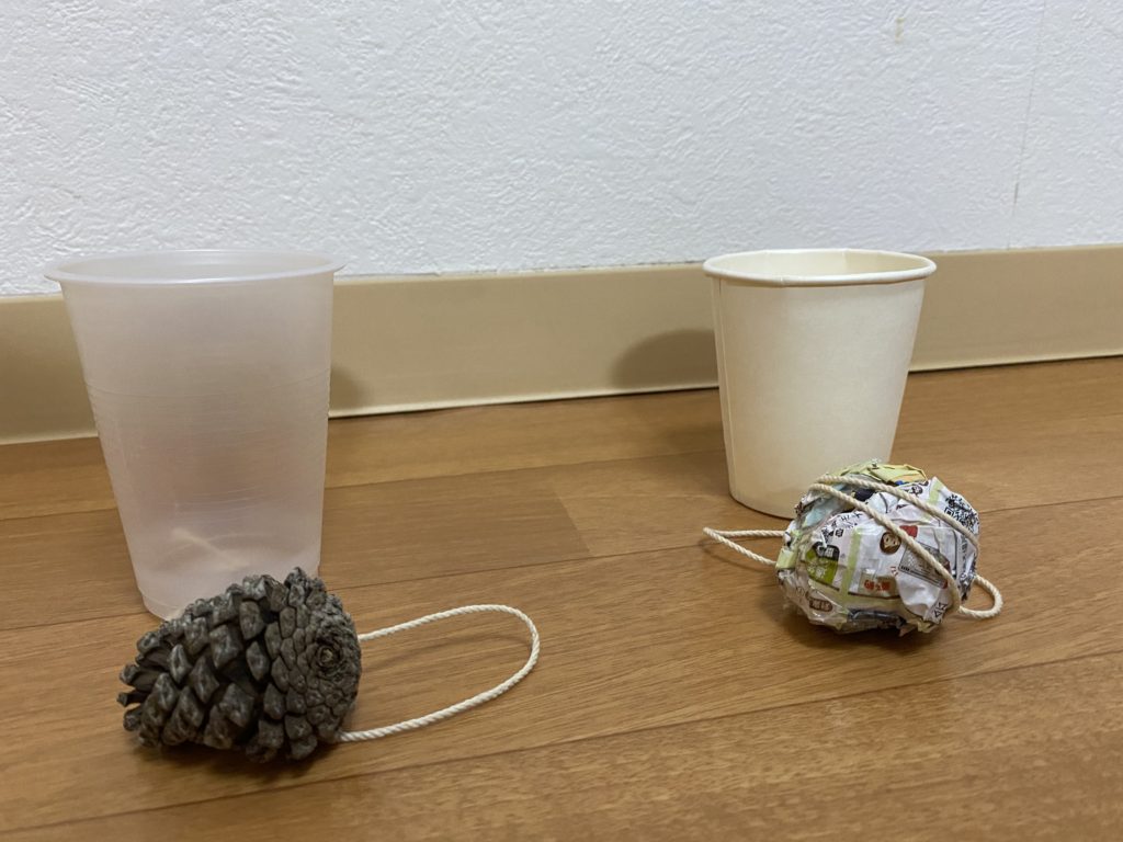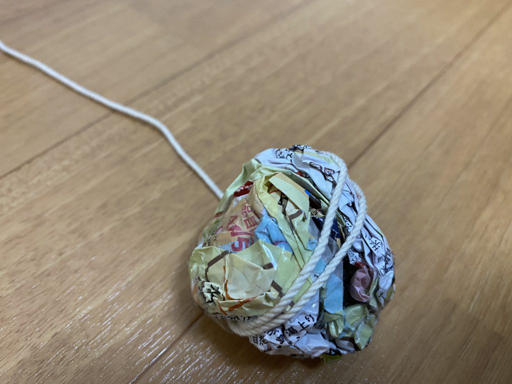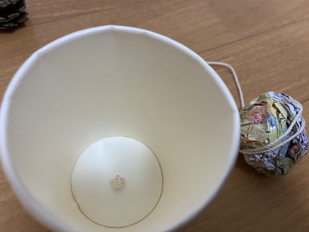 紙コップの中央に穴をあけて、タコ紐を通すだけです。そして、素材となる玉を付けます。