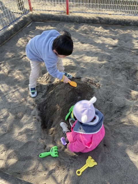 砂遊びは0歳から小学生まで夢中になる要素があります。砂場に多様な年齢の子どもがいることで、見て学んで、また一緒に遊び遊び方や表現力、語彙力、社会性を伸ばす要素がたくさんあります。そして、異年齢で関わることでたくさんの「憧れ」や「挑戦」「気づき」が生まれます。