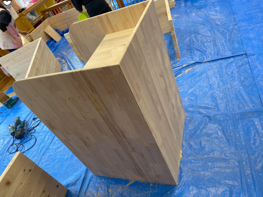 今回は、こどもの環境整備と平行して、保育室に置く作業テーブルや物置を工具置き場に作り替えを行いました。