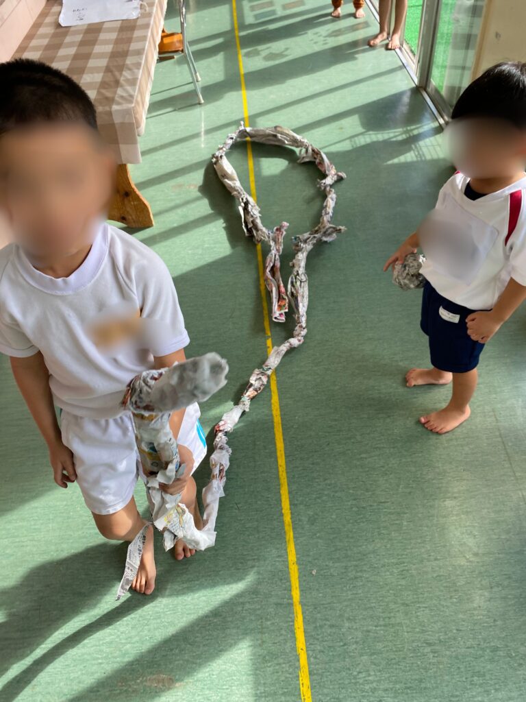 新聞紙でヘビが作られていると、「僕も作る」という声が重なり、次々と長いヘビが生まれていきました。