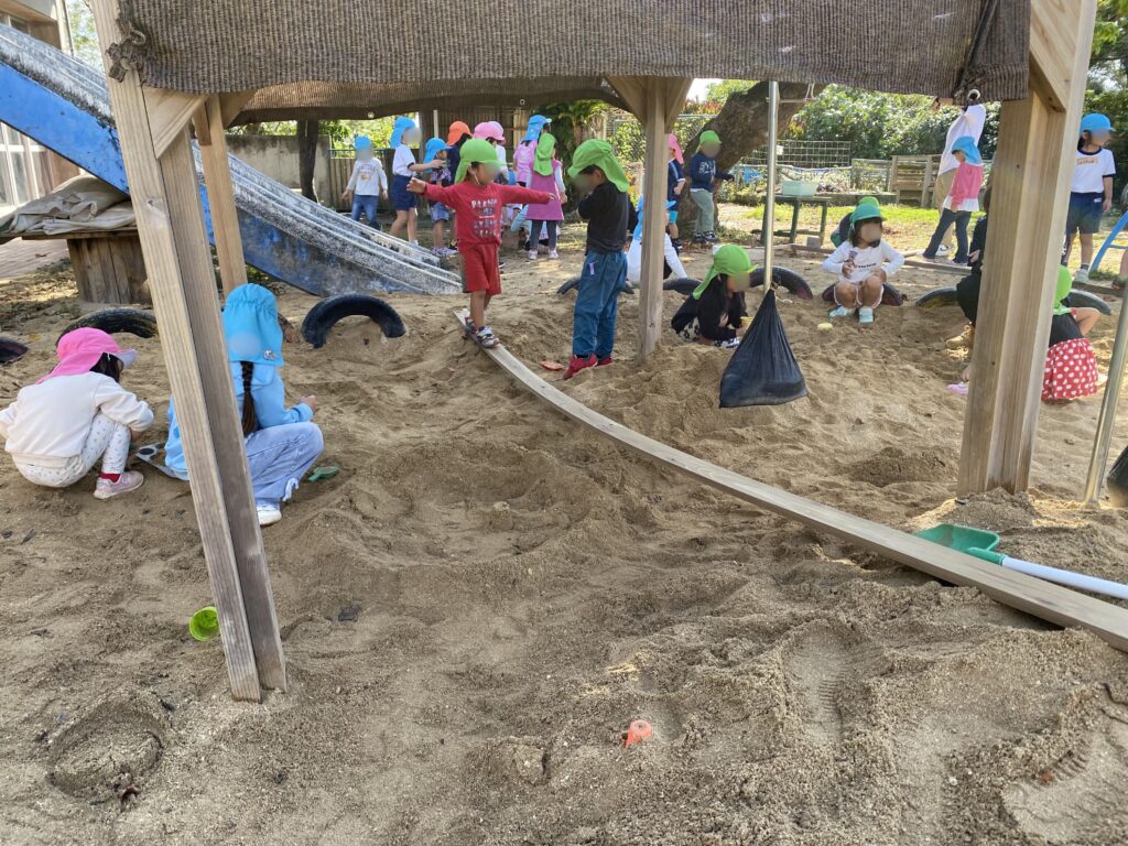 圧巻だったのは、砂場に架けた4メートルの長い橋です。一人、また一人と渡る人数が増えるたび、木材は大きくたわみます。「おっとっと!」とバランスを取りながら、重さと素材の関係を肌で感じていくこどもたち。慎重に渡っていきます。大きく転倒する姿もありましたが、再び橋渡りに戻ります。