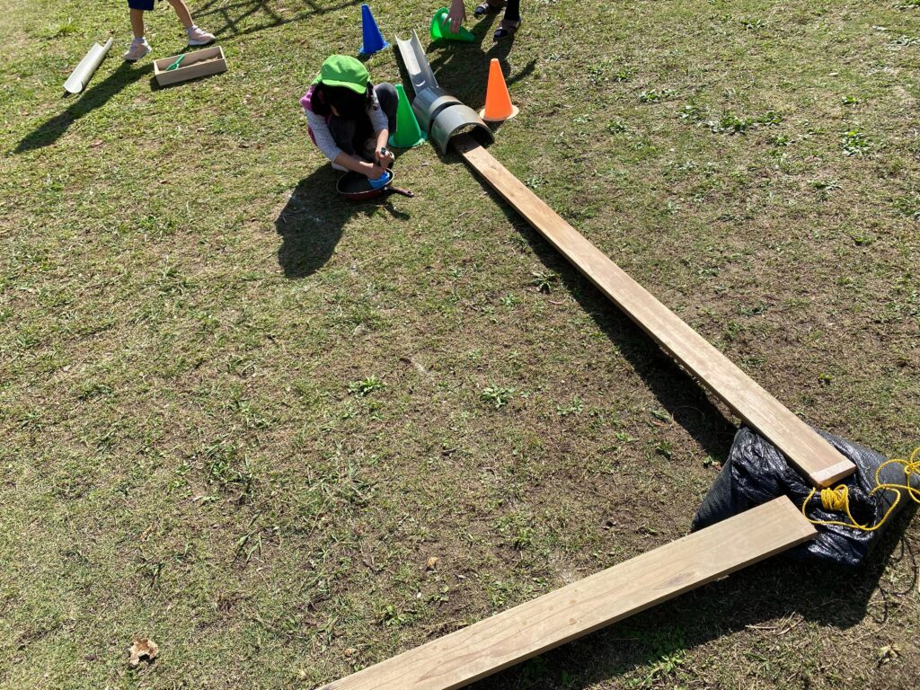 水遊び用の雨樋も活用しています。両端に置いてあるコーンは、休憩所とのこと。ここに手をかけて休むようです。自分たちでストーリーを作りながら、意味づけをしています。