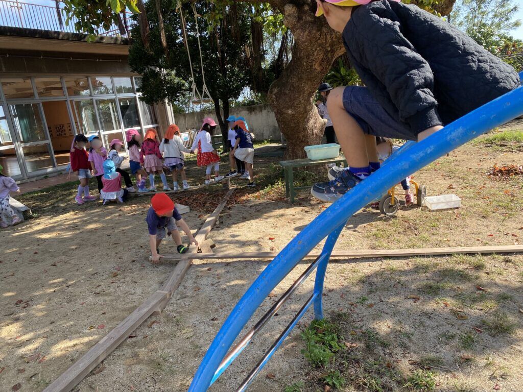 あるこどもは、立てかけてある厚い木材2本の上を忍者のようにリズムよく飛んで移動していました。