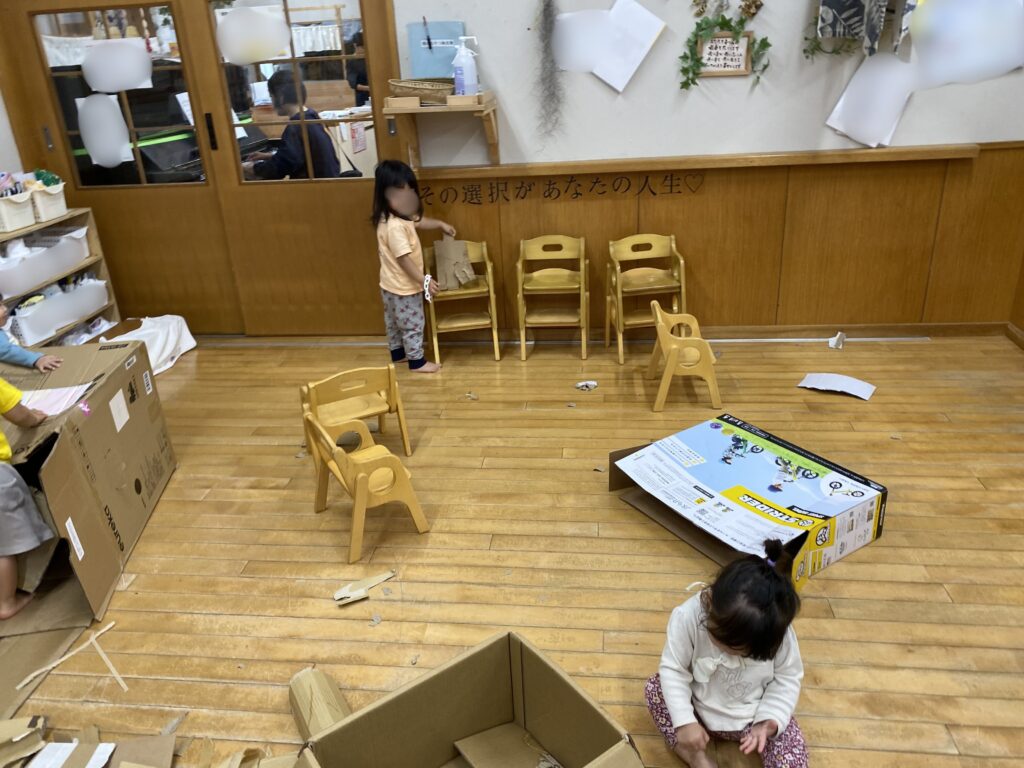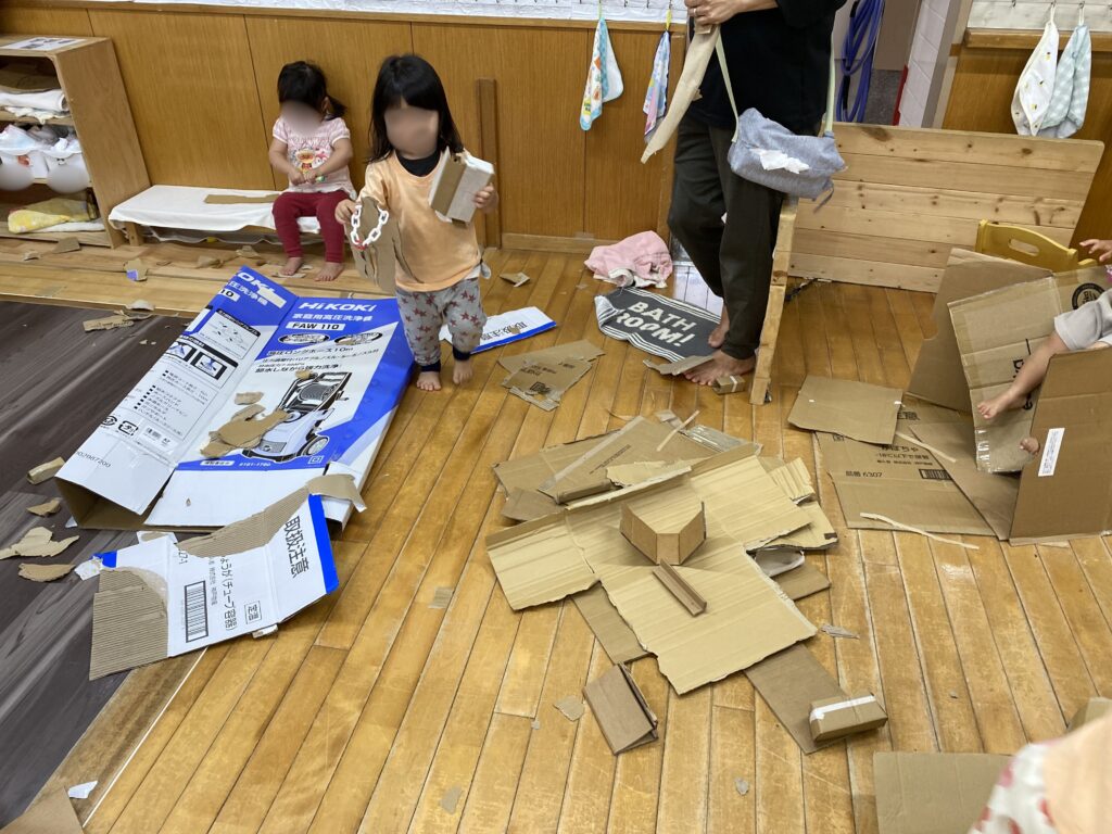 今回は、0歳児と1歳児のクラスにダンボールを提供し、こどもたちからどのような応答を見えるのかを観察しました。
