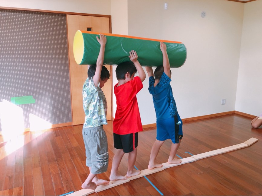 条件は、材木の上を落ちないように歩きながら、頭の上に乗せて運ぶです(^^♪